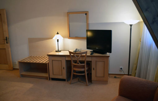 Ein sehr geräumiges und gemütliches Zimmer im Loft-Stil verfügt über ein großes Doppelbett, eine Sitzecke mit Couchtisch, einen Schreibtisch, ein Telefon, eine Minibar, ein Badezimmer mit WC und Dusche, ein Bidet, einen Haartrockner, und Toilettenartikel.